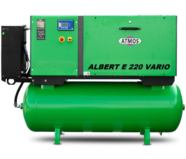 Az ATMOS Albert E.220 VARIO elektromos kompresszor 20 kW-os motorral és 0,9–3,3 m³/perc légszállítással biztosítja a változó igényekhez való alkalmazkodást. A 6–10 bar nyomás, a 63–75 dB zajszint és az 500 literes tartály a folyamatos levegőellátást garantálja. Az opciós osuszítóval még magasabb hatékonyság érhető el, ideális választás ipari feladatokhoz.