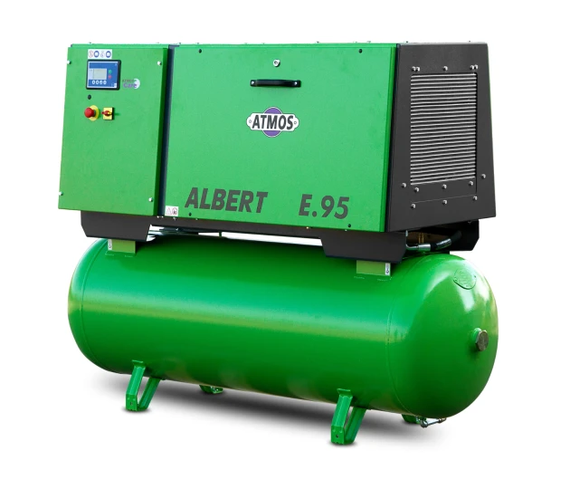 Az ATMOS Albert E.95 elektromos kompresszor 9 bar munkanyomással és 1,6 m³/min levegőszállítással rendelkezik. A 11 kW-os motor és közvetlen meghajtás biztosítja a maximális energiahatékonyságot. A kompresszor 500 literes tartállyal és 67 dB-es zajszinttel működik, kényelmes munkakörnyezetet biztosítva. Opcionálisan osuszító csatlakoztatható a levegő minőségének javítására.