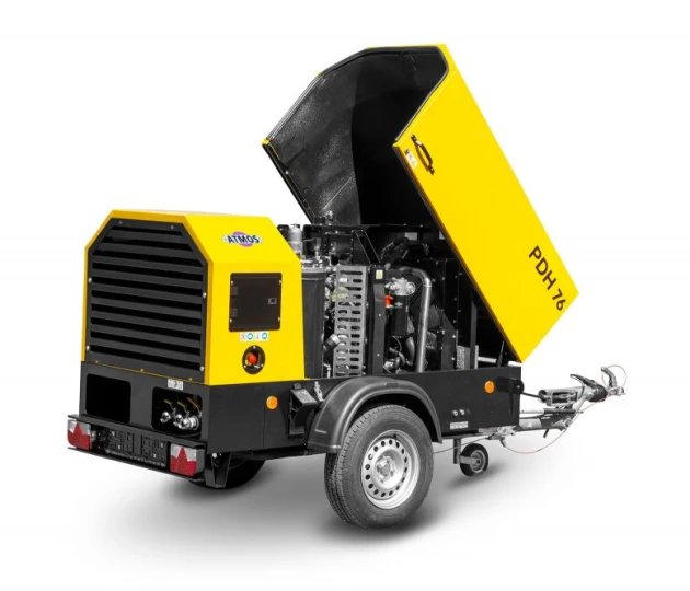 Az ATMOS Chrást mobil építési kompresszorai megfelelnek minden európai szabványnak, és 1 m³/perc és 28 m³/perc teljesítmény között elérhetőek az EU piacán. A kiváló minőségű anyagokból készült gépek modern belső égésű motorokkal működnek, amelyek megfelelnek a legszigorúbb Stage V kibocsátási előírásoknak. Környezetbarát kialakításuk folyadéktartó tálcával és csendes működéssel rendelkezik, míg könnyű szerkezetük megkönnyíti a közúti és építési területen való használatot. A kompresszorok minden időjárási körülmény között megbízhatóak, és egyszerűen karbantarthatók. Számos opció, például utóhűtő, szikrafogó, hidegindítás és távirányító is választható, valamint különféle modellváltozatok is elérhetők, beleértve a fékezett, fékezetlen, csúszótalpas vagy dobozos kiviteleket.